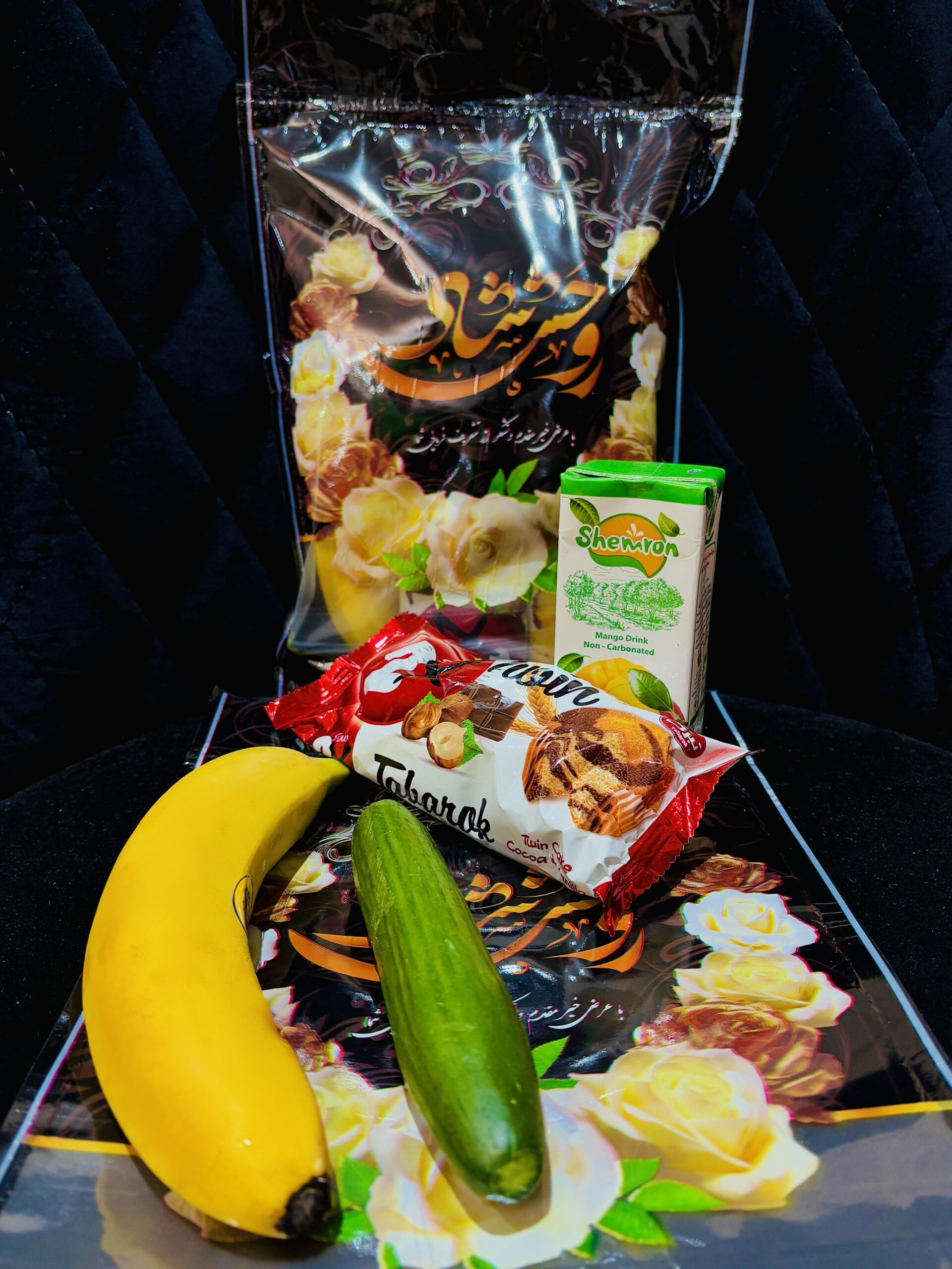 - محتویات: موز اکوادور، خیار مجلسی، آبمیوه پاکتی،کیک دوقلو